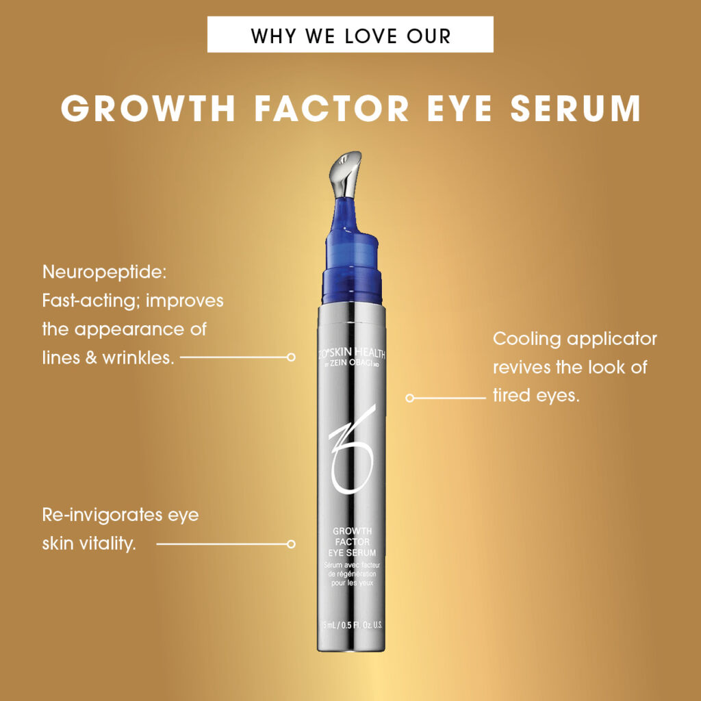 The Growth Factor Eye Serum also contains ZO's clinically proven growth factor technology and is specifically designed with ingredients that target the delicate eye area GROWTH FACTOR EYE SERUM This eye serum targets deeper eye wrinkles, crease formation, hollowness + microcirculation decline Powered by clinically proven ZO® Growth Factor technology, Growth Factor Eye Serum is designed to help improve the appearance of expression lines, creasing + hollowness while plumping + encouraging healthy skin for a visibly revived look
